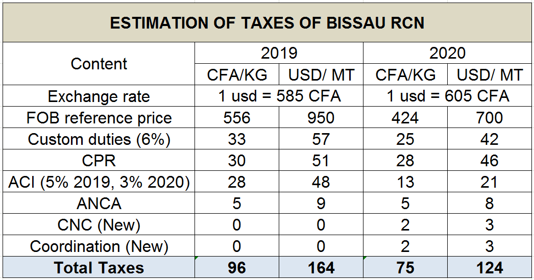 The Bissau government, the main factor of managing the season, has issued a series of measures and policies to support the marketing of cashew season this year, such as reducing the tax on the Minimum reference fob price from 950 usd / ton to 700 usd / ton with the reference farmgate price of 375cfa / kg. The new tax rates are detailed in the following table.